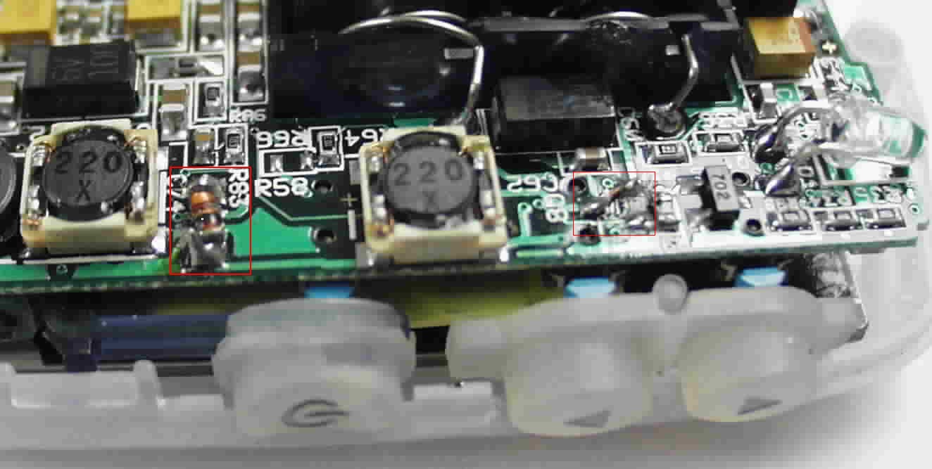 rectangle show the modifications: the left one is the diode already soldered (