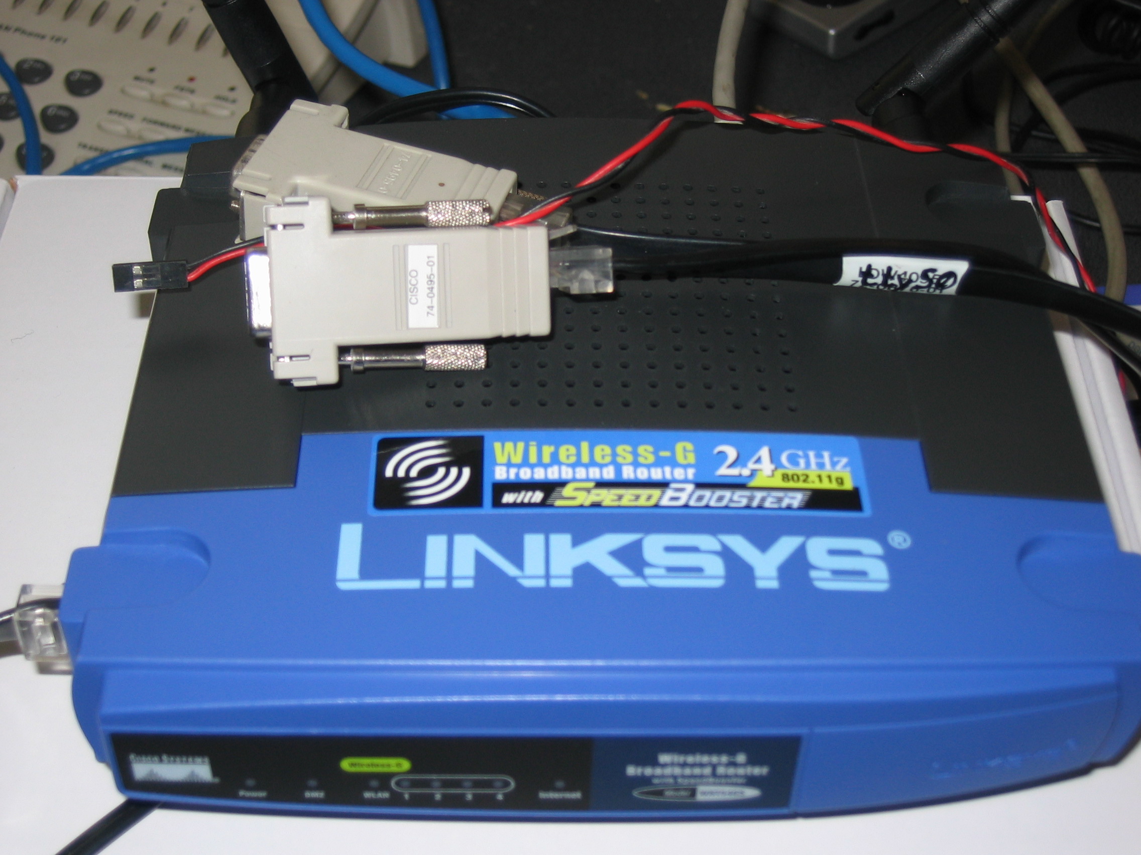 Mivel szükség lett volna egy olyan eszközre,mellyel távolról újra lehet gépeket indítani, a keresgélés során egyszer csak rábukkantam a Linksys WRT54G sorozatával kapcsolatban közölt cikkekre. A leírtak alapján ezzel az eszközzel minden szóba jöhetö feladatot el lehet végezni, így azonnal beszereztem a készüleket és nekiálltam a módosításoknak. Sajnos csak miután készen lettem találtam meg ezt a kiváló leírást: http://www.franken.de/de/veranstaltungen/kongress/2004/04-3-4-linksys_wrt54g.pdf ( local copy ) . Mindenesetre sikerült a két soros vonal szintillesztését megcsinálnom; a távoli számítógép újraindításához pedig az egyik GPIO vonalat egy diódával védve és a földet a egy kétpólusú csatlakozóval a számítógép RESET csatlakozójához lehet kötni.